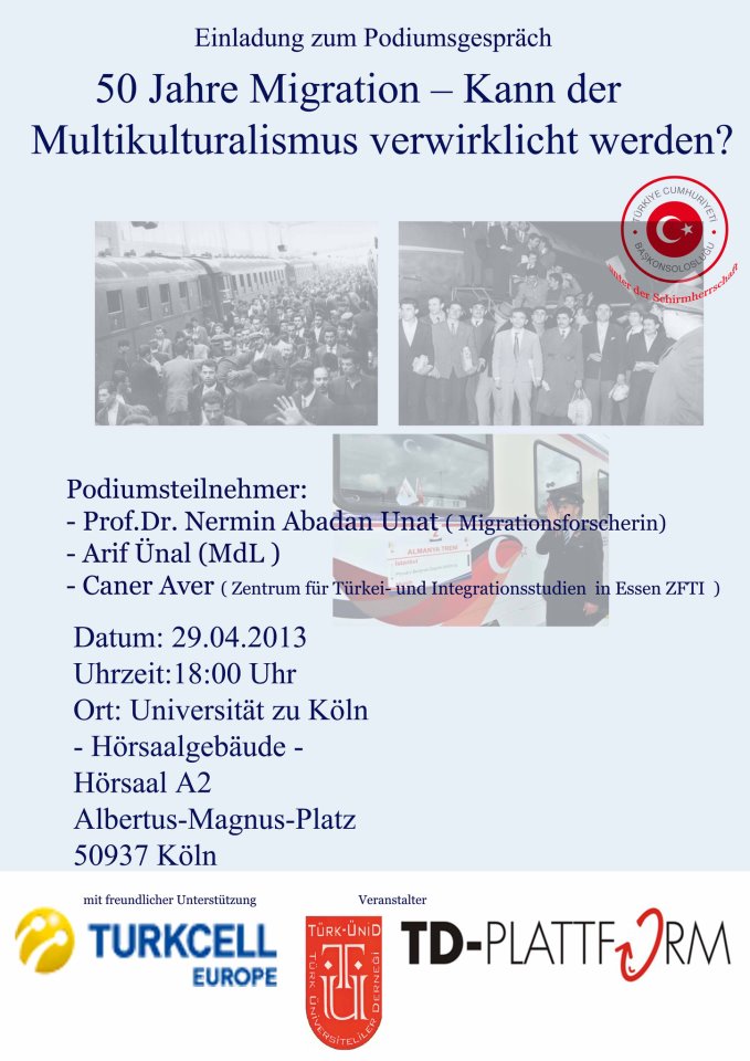 Hiermit möchten wir Sie als TD Plattform e.V. und als türkischer Studenten und Akademikerverein Türk ÜniD e.V. gerne zu unserem Vortrag mit Prof.Dr. Nermin Abadan Unat ,Caner Aver vom Zentrum für Türkeistudien und Integrationsforschung und Arif Ünal ( MdL) einladen. Nermin Abadan-Unat ist eine deutsch-türkische Soziologin und Frauenforscherin. Die international bekannt gewordene Sozialwissenschaftlerin ist eine Pionierin der kritischen Erforschung der Migration nach Deutschland. Caner Aver arbeitet seit 2003 als wissenschaftlicher Mitarbeiter im Zentrum für Türkeistudien in Essen. Seine Arbeitsschwerpunkte sind die zielgruppenorientierte Forschungs- und Modellprojekte (ethnische Ökonomie, Umwelt- Naturschutz, Türkei – EU Beziehungen), Politikberatung und Öffentlichkeitsarbeit. Arif Ünal leitet seit 1995 das Gesundheitszentrum für MigrantInnen in Köln und das Sozialpsychiatrische Kompetenzzentrum für Migration im Landschaftsverband Rheinland und ist Abgeordneter im Landtag NRW der Grünen/Bündnis 90, wo er als Sprecher für Integrationspolitik, Gesundheitspolitik und interreligiösen Dialog verantwortlich ist.