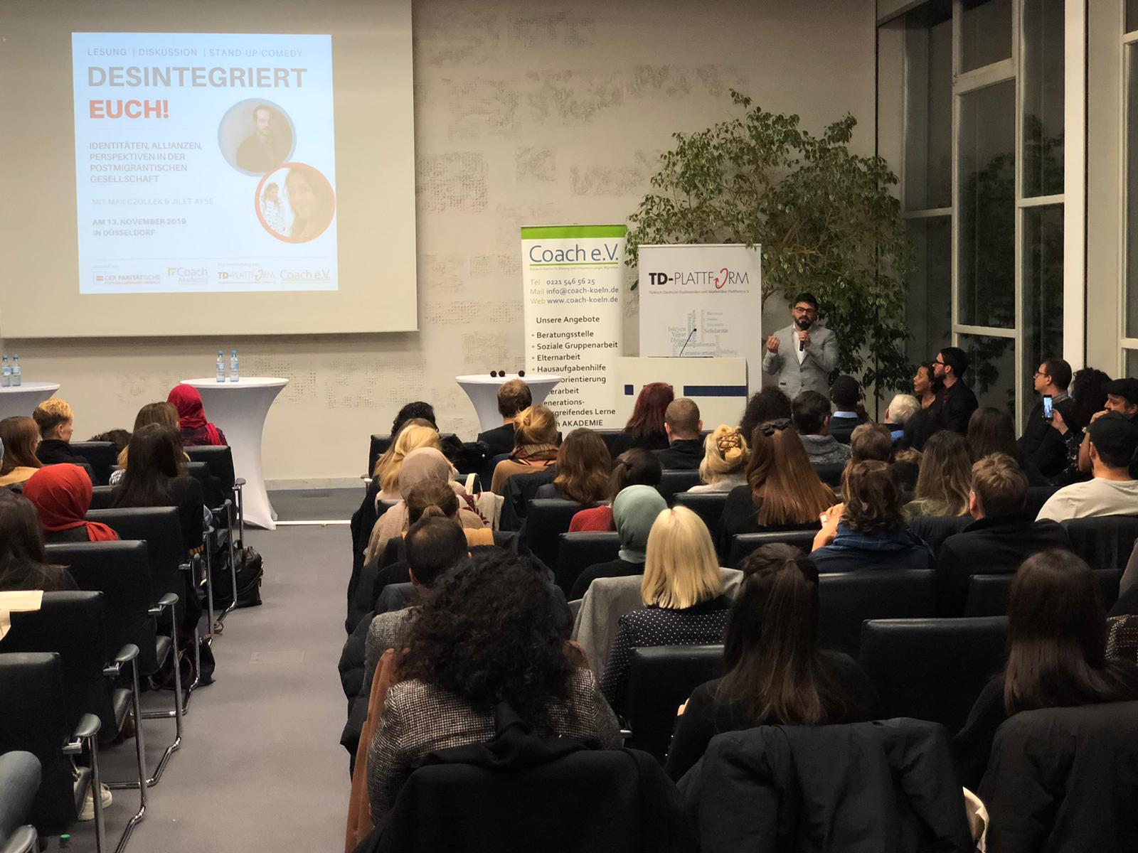Nach einer kurzen Pause folgte der kabarettistische Teil des Abends mit Jilet Ayse, ehe danach die Podiumsdiskussion mit Max Czollek, Jilet Ayse, Ahmet Edis (1.Vizepräsident der TD-Plattform e.V.) und Ahmet Sinoplu (Geschäftsführer Coach e.V.) erfolgte.