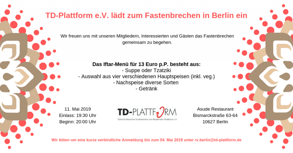 die wohl schönste Gepflogenheit des Ramadan ist das gemeinsame Fastenbrechen mit Freunden, Gästen und Verwandten. Daher möchten wir in diesem Jahr die Gelegenheit wahrnehmen und Dich herzlich zu unserem Fastenbrechen in Berlin einladen.