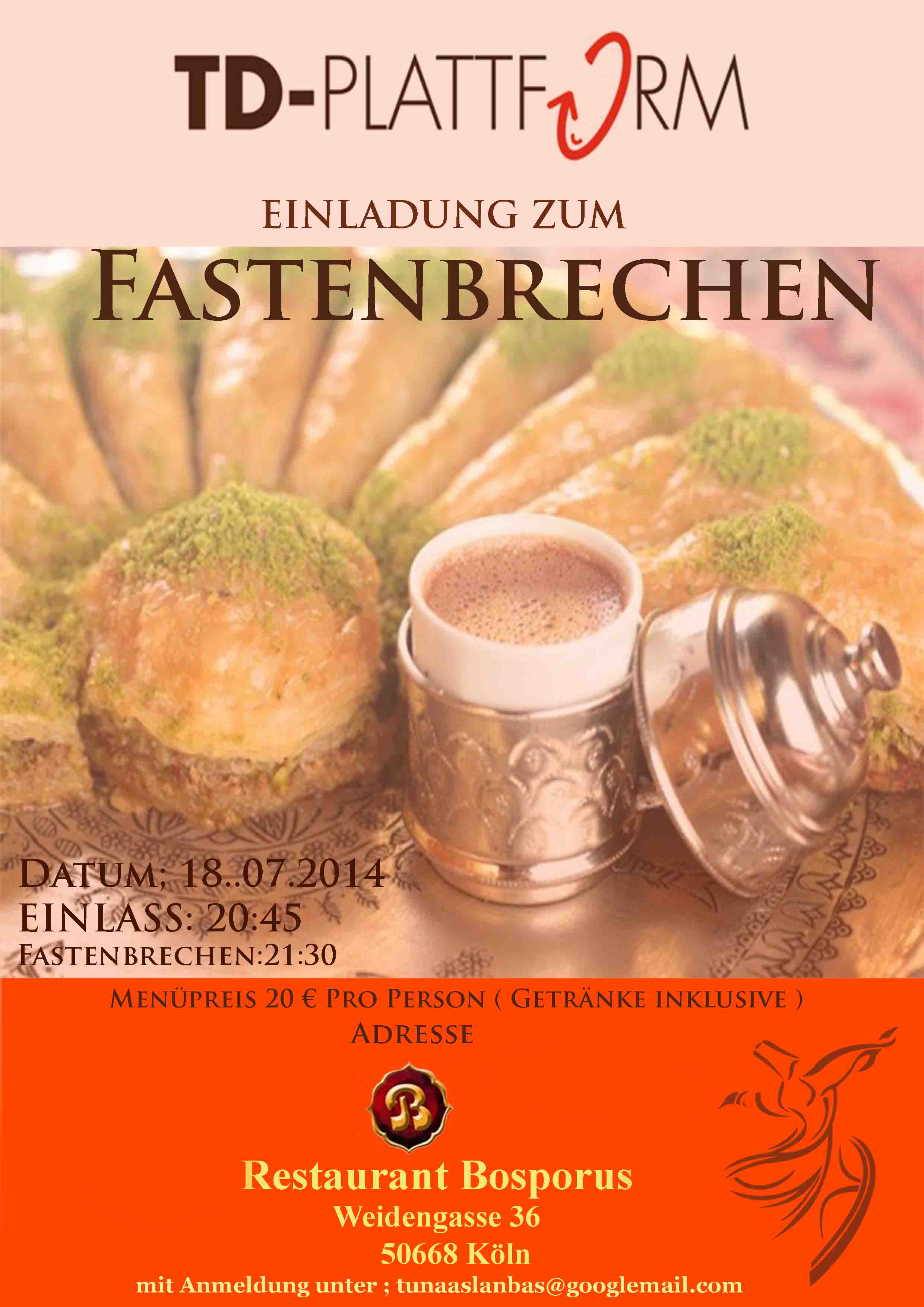 möchten wir euch alle herzlich zu unserem diesjerigen Iftar-Abend in Köln einladen. Wir würden uns freuen, euch am 18.07.2014 im Bosporus Restaurant ( Terassenbereich) begrüßen zu können. Eingeladen sind wieder prominente Gäste aus der Politik und Wirtschaft. Das Fastenbrechen beginnt um 21:30 Uhr und wir erwarten euch ab 20:45 Uhr. Da unsere Plätze begrenzt sind, bitten wir euch alle um verbindliche Anmeldung unter tunaaslanbas@googlemail.com.